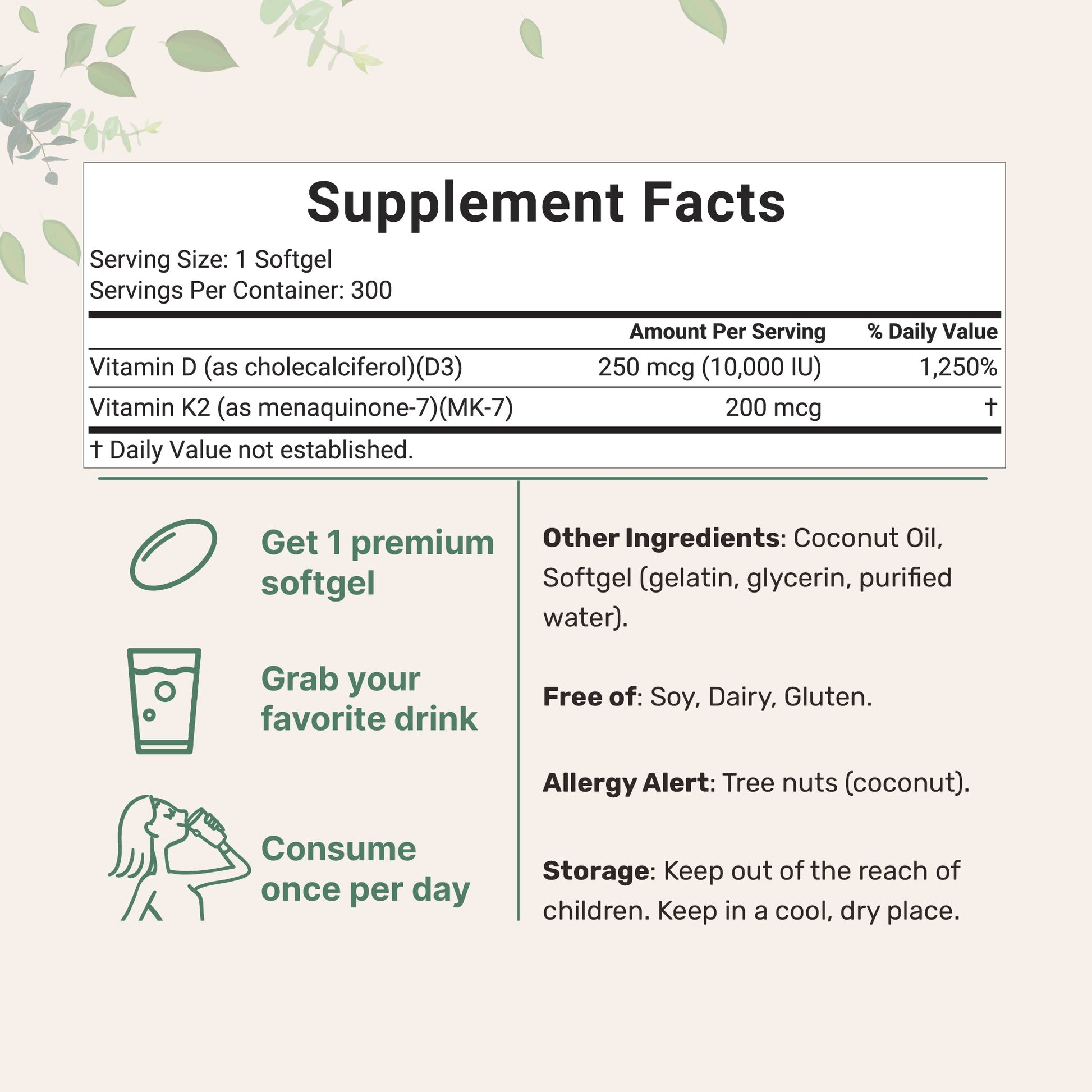 Choose from 10,000 IU or 50,000 IU of D3 + 200 mcg of K2