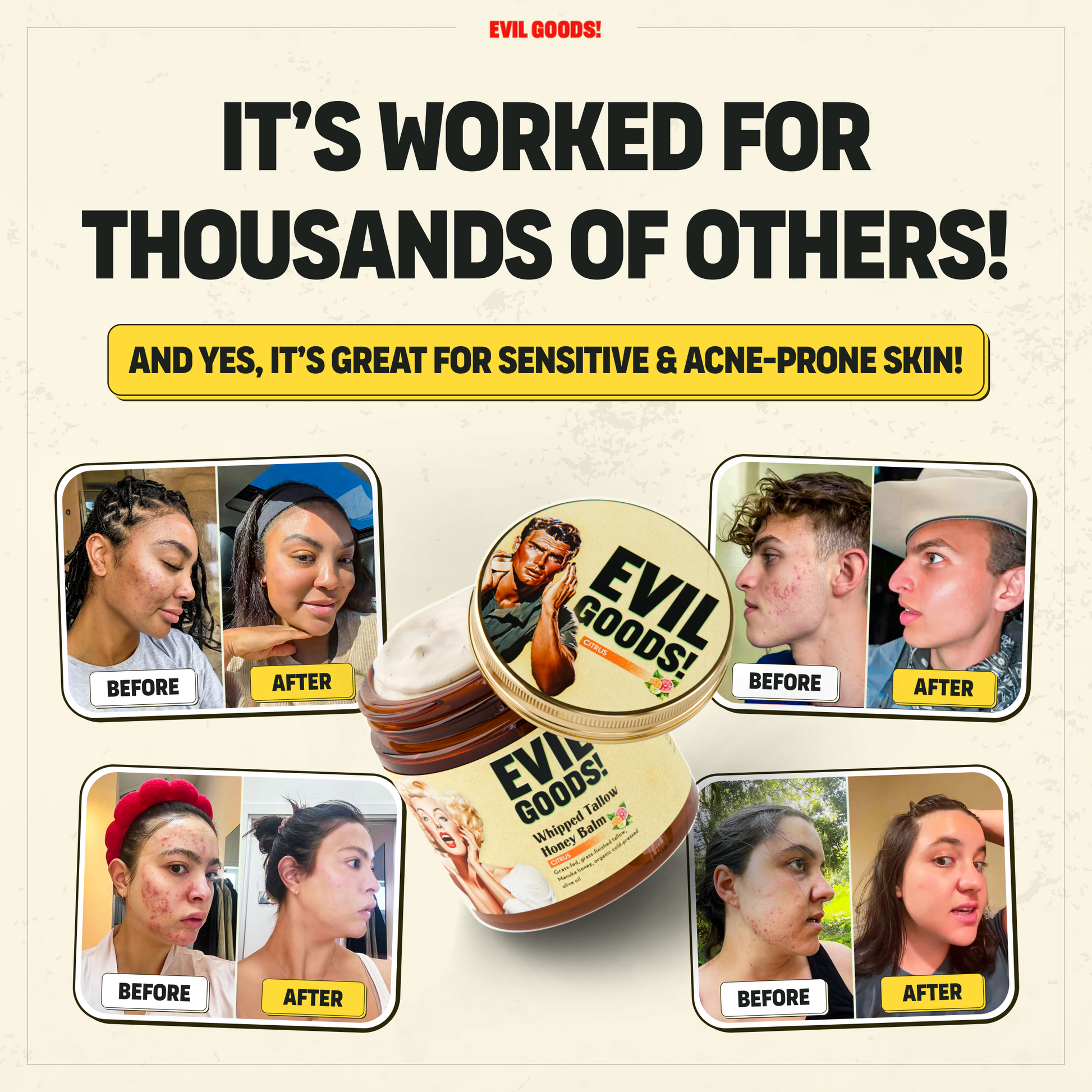 He probado todas las ofertas de cuidado de la piel carísimas, pero nada funcionó a largo plazo. EVIL GOODS lo cambió todo. Después de 30 días, mi piel no solo está más limpia, sino más fuerte. Se acabaron las quemaduras y los brotes misteriosos. Solo una piel auténtica, calmada y que de verdad sana. Este producto es la verdad.